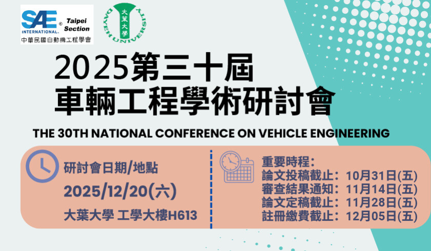 由中華民國自動機工程學會(SAE Taipei Section)主辦,大葉大學機械與自動化工程系承辦的「第30屆車輛工程學術研討會」將於 2025 年 12 月 20 日(六)在 大葉大學 舉行!【參展】12/20_第30屆車輛工程研討會